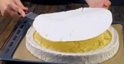 - Déposez le brie géant sur une plaque à pâtisserie recouverte de papier sulfurisé et faites une incision sur le dessus, comme montré dans la vidéo. Laissez une bordure d'environ 3 cm de large. Coupez le "couvercle" à plat avec un couteau puis retirez-le et mettez-le de côté.