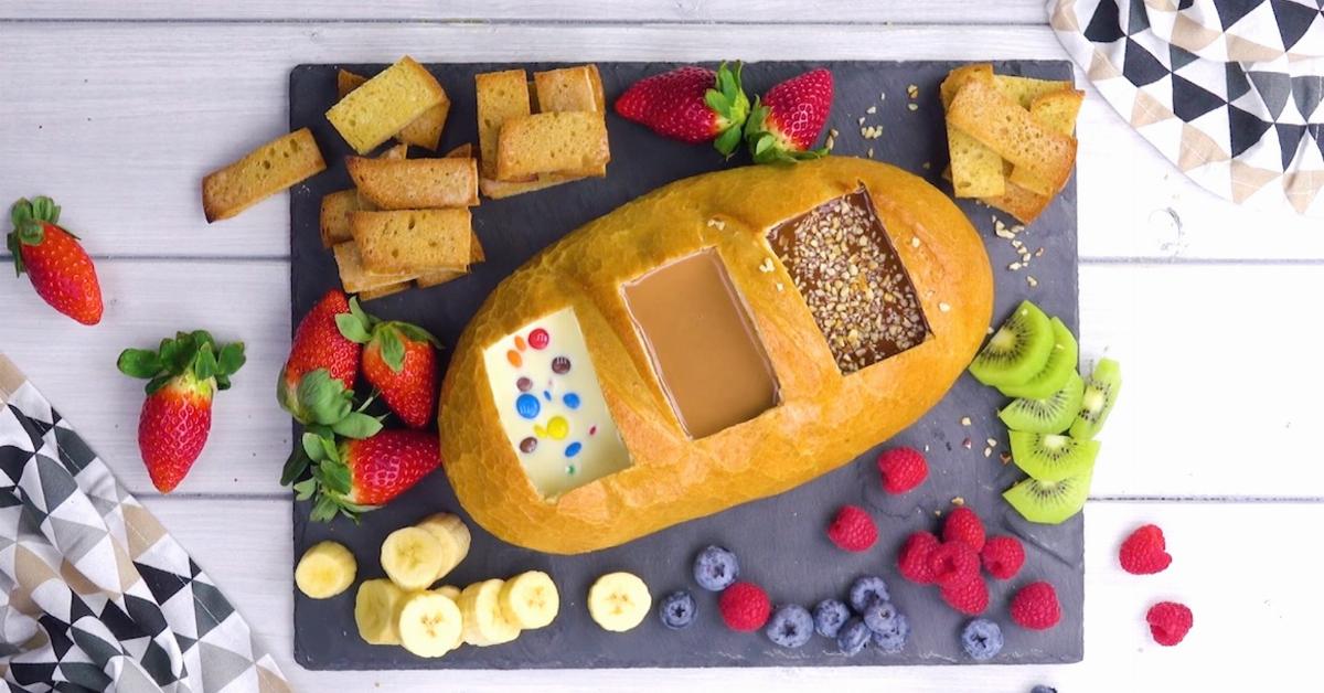 - Remplissez les trous dans le pain avec les différents chocolats. Couvrez le pain avec une feuille d'aluminium et enfournez-le, avec les bâtonnets, à 60 °C pendant 30 minutes. Remuez de temps en temps le chocolat pour qu'il fonde uniformément.