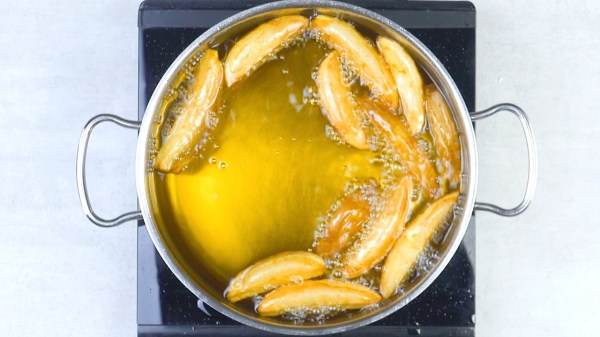 - Faites chauffer l'huile dans une casserole et faites frire les pommes de terre pendant 4 à 5 minutes à environ 165 °C. Égouttez-les à nouveau brièvement.