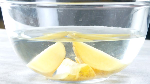 - Coupez les pommes de terre en tranches à l'aide du coupe-pomme. Placez les tranches dans l'eau pendant environ 30 minutes pour éliminer l'amidon. Égouttez-les sur un chiffon.