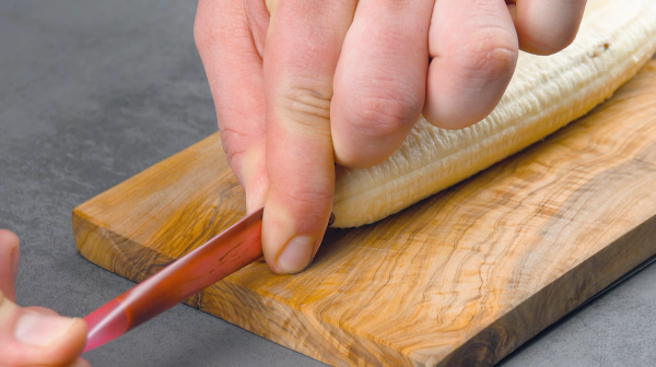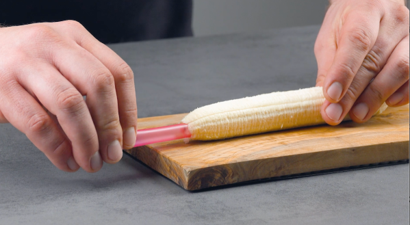 - Pelez une banane et percez-la dans le sens de la longueur avec une paille. Videz l'intérieur du fruit avec la paille.