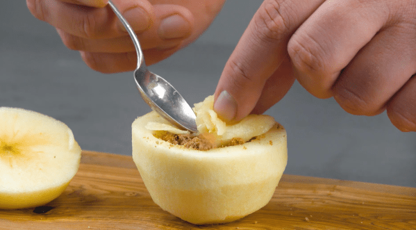 - Coupez le dessus de la pomme et évidez le reste du fruit à l'aide d'une cuillère. Enlevez les pépins et mettez la chair du fruit de côté. Émiettez un biscuit dans la pomme évidée, puis ajoutez la chair du fruit et les noix de pécan finement hachées.