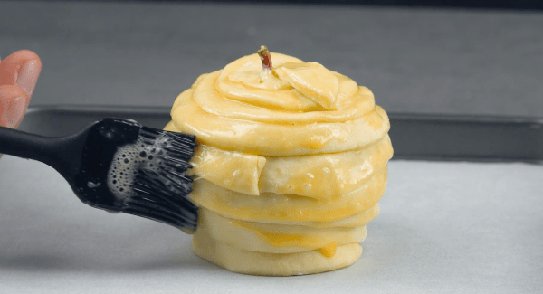 - Enveloppez complètement la banane avec les bandes de pâte et badigeonnez-les d'œuf battu. Enfournez la banane à 200 °C pendant 15 minutes.