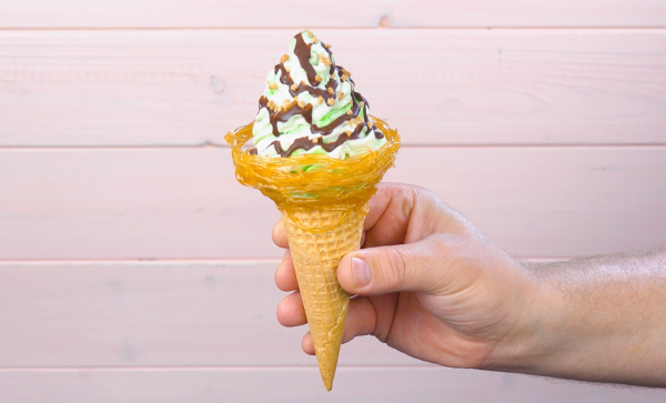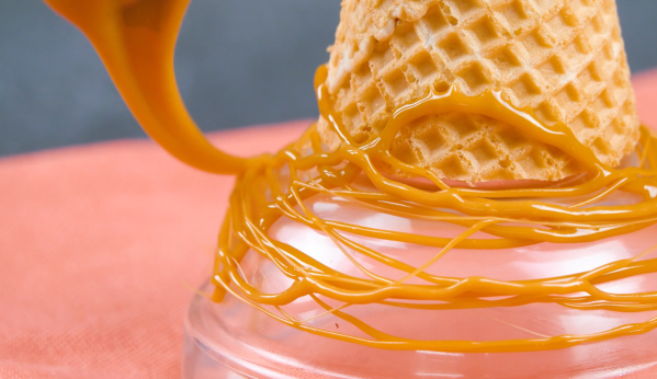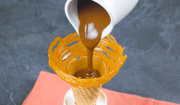 - Faites fondre les bonbons au caramel dans une casserole. Placez un cornet de glace avec l'ouverture vers le bas sur un bol retourné (il est préférable d'huiler un peu le bol au préalable). Utilisez ensuite une cuillère pour dessiner des bandes de caramel autour du cornet. Répétez ce processus jusqu'à ce qu'un panier compact soit formé autour du cône. Laissez le caramel refroidir pendant environ 5 minutes, puis retirez délicatement le cornet de glace du bol.
