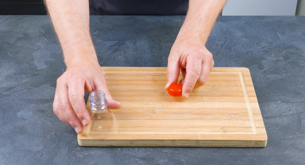 - Coupez le goulot de la bouteille et dévissez le bouchon. Découpez une étoile dans le bouchon. Remettez le bouchon sur la bouteille coupée. Coupez un coin du sachet en plastique et faites passer le goulot de la bouteille à travers ce coin coupé.