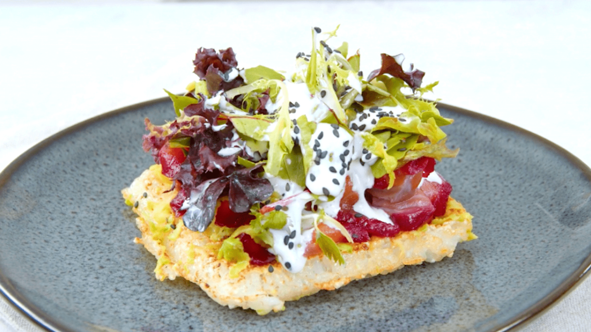 Avez-vous déjà fait mariner du saumon vous-même ? Ce n’est pas difficile du tout ! Dans cette recette, nous ajoutons même une petite touche de couleur au saumon. Ce délicieux poisson est servi sur une galette de riz cuite au four avec de l’avocat, de la salade et de la sauce au yaourt. Un véritable plaisir, et pas seulement en été. On vous montre :
