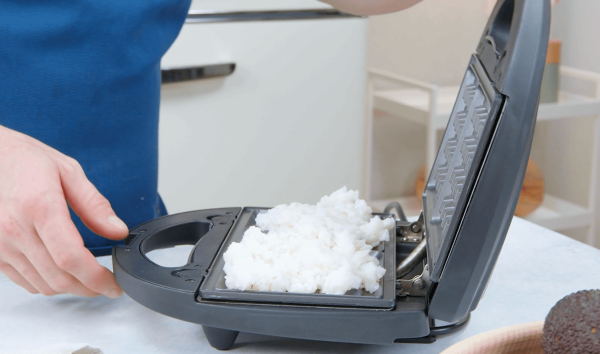 - Huilez le gaufrier et répartissez le riz sur le fer. Faites cuire le riz jusqu'à ce qu'il soit doré.