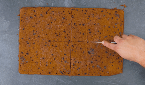 - Retournez la plaque de cuisson et retirez le papier sulfurisé. Coupez ensuite le gâteau en 4 rectangles égaux. Ensuite, empilez les rectangles de gâteau en alternant avec la crème chantilly. La couche supérieure de la crème doit être aussi lisse que possible. Soignez les contours du gâteau en retirant l'excédant de crème avec une spatule ou un couteau.