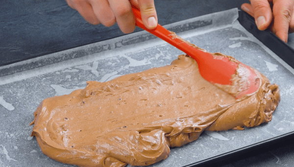 - Répartissez uniformément la pâte sur la plaque de cuisson recouverte de papier sulfurisé et mettez-la au four à 180 °C pendant 15 minutes, en mode convection. Laissez le gâteau refroidir pendant environ 30 minutes.