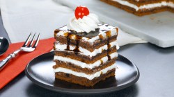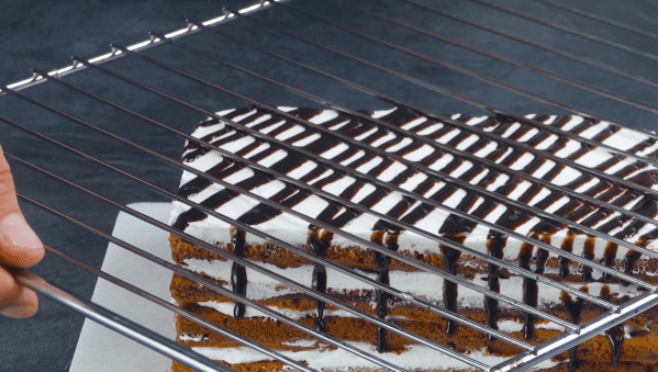 - Répartissez la sauce au chocolat en bandes diagonales sur la couche supérieure de crème, puis pressez doucement une grille de four à travers les bandes à un angle de 90 degrés pour créer un joli motif. Versez encore quelques cuillerées de crème sur le dessus du gâteau et décorez le nappage de crème avec des cerises au marasquin.