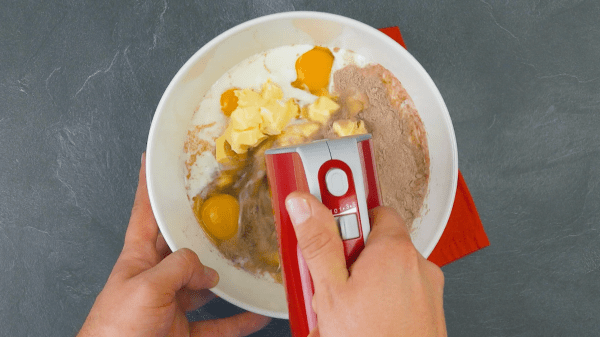 - Mettez le mélange pour pâtisserie dans un saladier avec le beurre, les œufs et le lait et mélangez le tout avec un batteur.