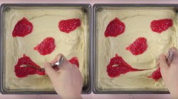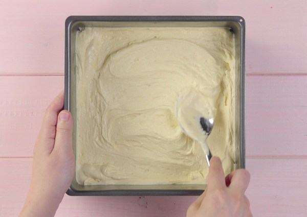 • Versez d'abord la moitié de la pâte dans un moule à gâteau carré graissé (diamètre : 23 x 23 cm) et lissez le tout.