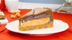 - Préchauffez le four à 170 °C. Étalez la pâte à biscuit dans un moule à charnière d'environ 32 cm de diamètre et pressez-la fermement. Sortez la garniture au beurre de cacahuètes du congélateur et sortez-la du moule. Placez la garniture au beurre de cacahuètes, côté chocolat vers le haut, sur la pâte à biscuits dans le moule à charnière. Remplissez le moule à gâteau avec la pâte à brownie. Enfournez-le et faites-le cuire pendant environ 45 minutes. Laissez le gâteau refroidir un peu avant de le servir.