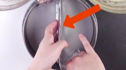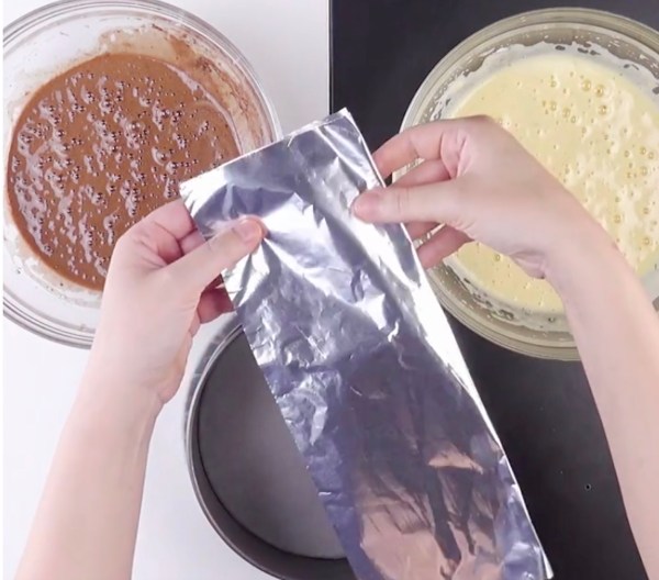 - Pour le moule à gâteau, prenez d'abord un morceau de papier aluminium et pliez-le plusieurs fois en une longue bande. Mettez cette bande au milieu du moule pour séparer les deux parties. Les extrémités de la feuille sont légèrement pliées.
