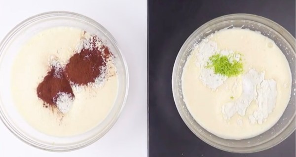 - Vous avez besoin de deux saladiers dans lesquels vous mélangez le sucre, les oeufs et l'eau tiède à parts égales. Dans les deux saladiers, ajoutez la farine et la levure chimique. Mettez maintenant la poudre de cacao dans l'un et les zestes de citron dans l'autre. Mélangez de nouveau le contenu des deux bols jusqu'à l'obtention de deux pâtes lisses.