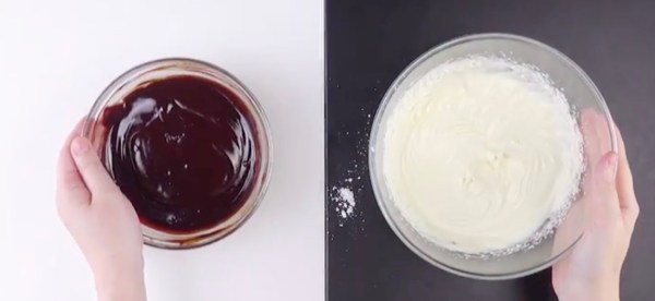 - Pendant ce temps, mélangez le chocolat avec la crème chaude dans un petit saladier jusqu'à l'obtention d'une masse homogène. Dans un deuxième saladier, mélangez le sucre glace, le fromage frais, la crème et le jus de citron vert. Ici aussi, remuez jusqu'à obtenir une masse homogène.
