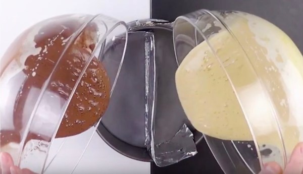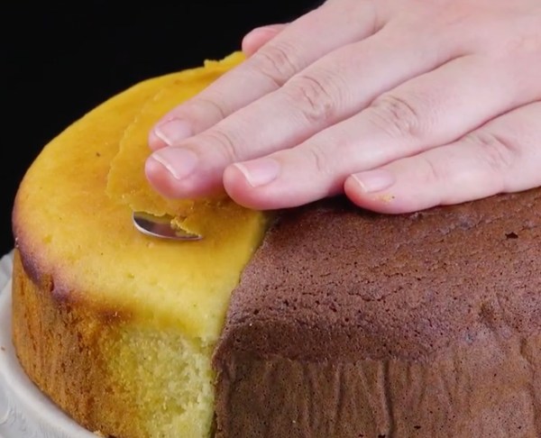- Versez les deux pâtes de chaque côté du moule à gâteau et enfournez le tout pendant 40 minutes à 175 °C en mode convection.