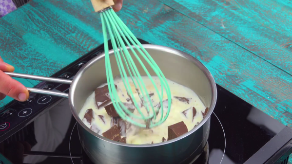 - Démoulez le gâteau et coupez-le en deux à l’horizontale. Faites chauffer la crème liquide dans une poêle et ajoutez le chocolat au lait coupé en morceaux. Remuez constamment jusqu’à ce que le chocolat ait complètement fondu.