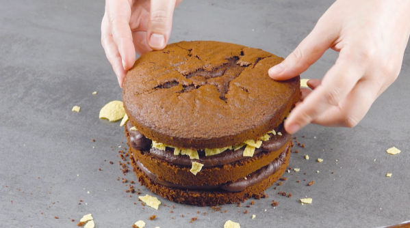- Versez maintenant la crème en forme de spirale sur l'une des bases du gâteau et émiettez les chips sur la crème. Placez une autre base sur les chips et étalez à nouveau la crème en spirale. Émiettez à nouveau les chips sur la crème et posez enfin le troisième fond de gâteau sur le dessus.