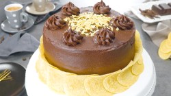- Versez le reste de la crème sur et autour du gâteau et recouvrez l'ensemble du gâteau avec la crème. Si vous avez un bec en forme d'étoile, mettez-le sur la poche à douille et dessinez six fleurs sur le gâteau. Mettez des Pringles qui se chevauchent en forme d'anneau tout autour du gâteau. Étalez quelques miettes de chips entre les fleurs et c'est fini !