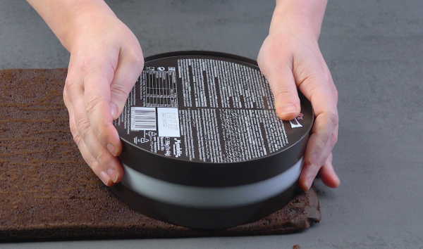 • À l'aide d'une grande boîte à biscuits, découpez deux cercles de taille égale dans la pâte à gâteau refroidie.