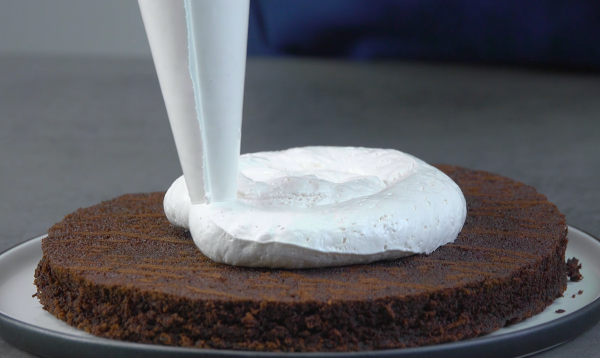 • Étalez la crème blanche de la poche à douille sur l'autre base du gâteau. Placez maintenant le gâteau avec le nappage au chocolat sur la crème, appuyez fermement et retirez le couvercle en métal. L'Oreo géant est prêt !