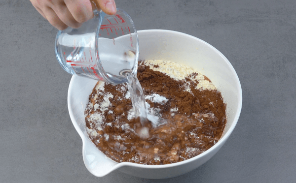 • Battez les œufs avec le sucre jusqu'à ce qu'ils deviennent mousseux. Ajoutez ensuite l'huile et le lait tout en remuant. Dans un autre saladier, mélangez la farine avec le cacao, la levure chimique, le bicarbonate de soude et le sel et ajoutez ce mélange au reste. Ajoutez ensuite de l'eau chaude.