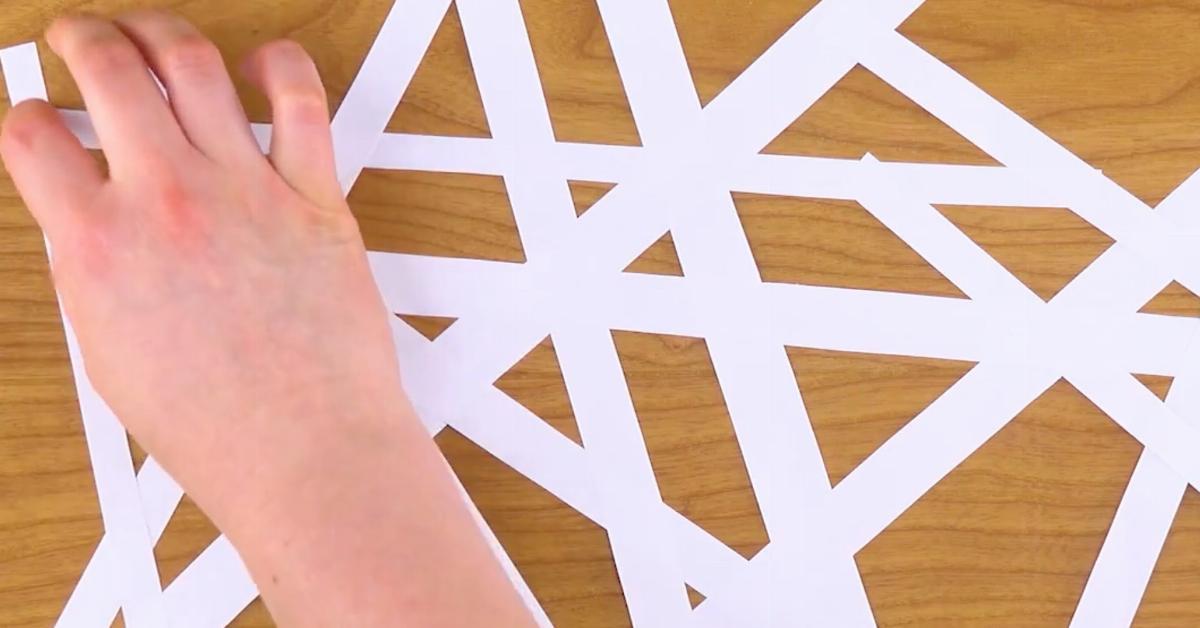 - Pour la déco, découpez des bandes de papier de la même taille puis collez-les ensemble dans la forme de votre choix. Une fois la ganache et la colle sèches, déposez le gabarit sur le gâteau puis saupoudrez de cacao en poudre.