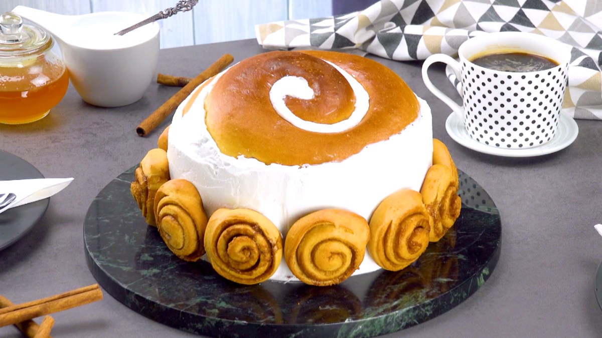 Il n’y a pas qu’en Scandinavie que les cinnamon rolls (roulés à la cannelle) jouissent d’une grande popularité. Comment résister à l’odeur d’une pâte levée fraîchement sortie du four avec de la cannelle et du sucre ? Et si les cinnamon rolls normaux sont trop petits pour vous, alors vous devez absolument essayer la recette suivante. Nous vous présentons un gâteau composé de 2 cinnamon rolls au format XXL, de crème et de cinnamon rolls de taille normale. C’est parti :