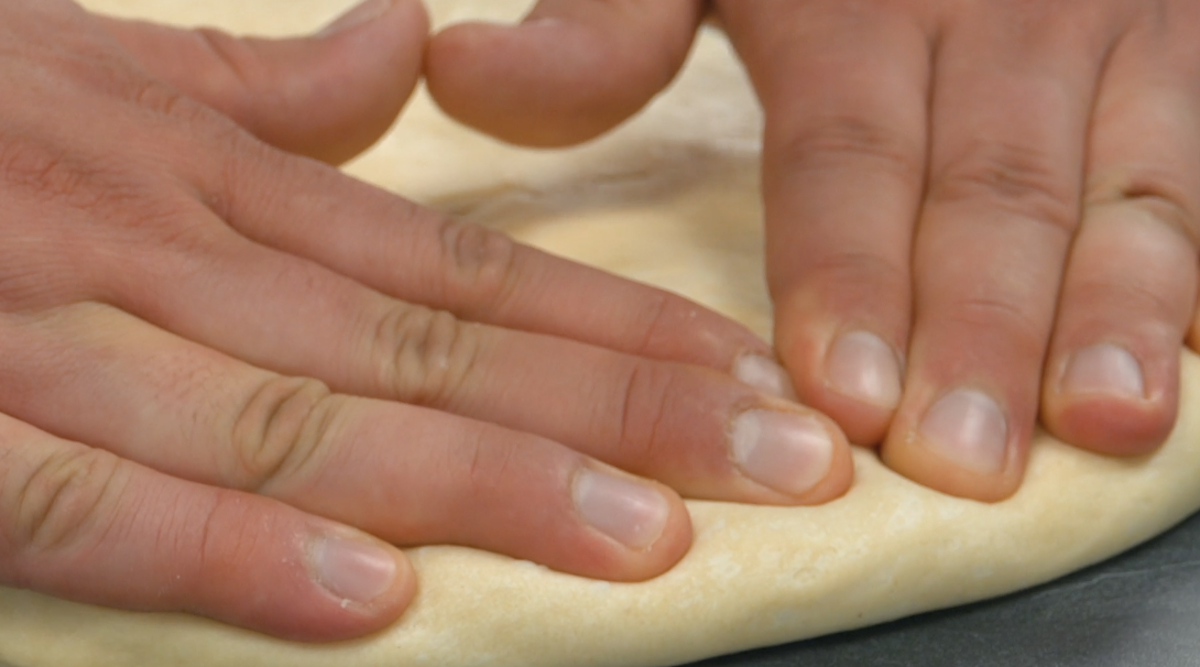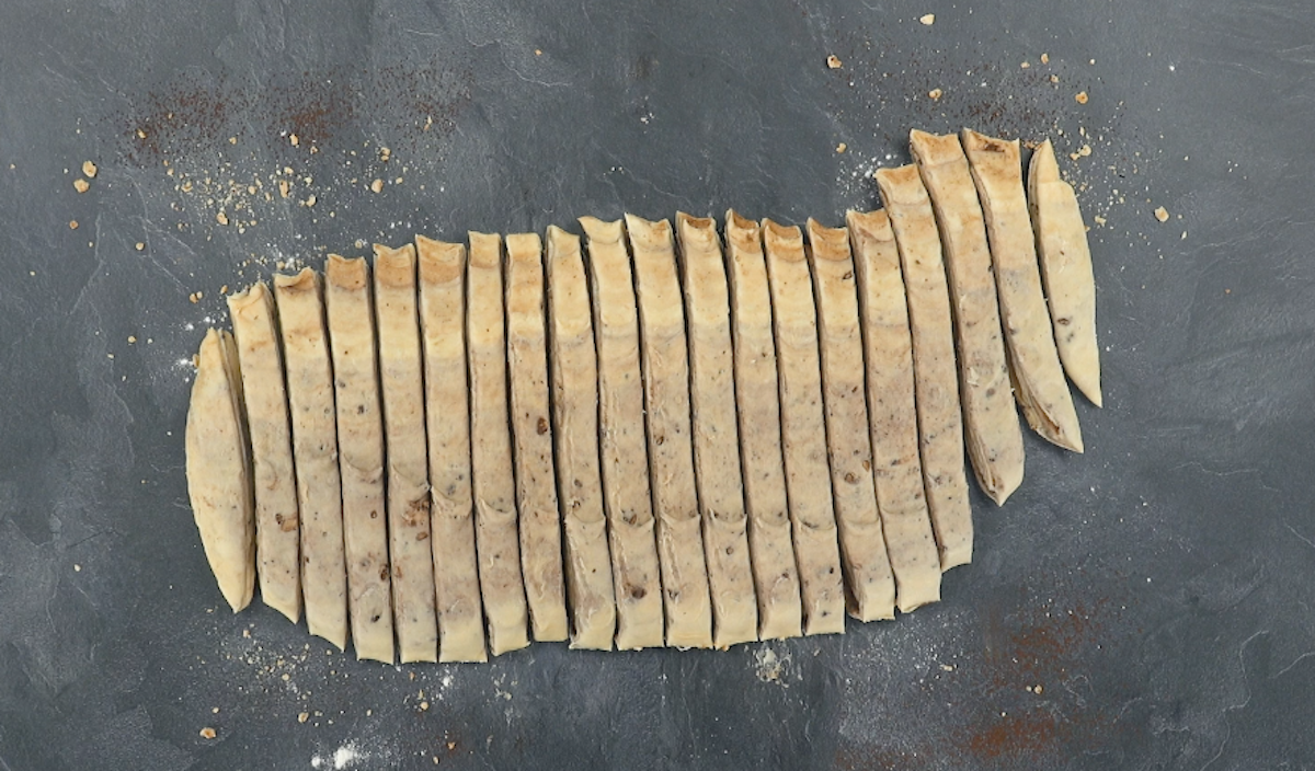 10) Préchauffez le four à 200 °C, à chaleur tournante. Étalez la pâte à une épaisseur d’environ 2 cm, puis coupez-la en plusieurs lamelles.