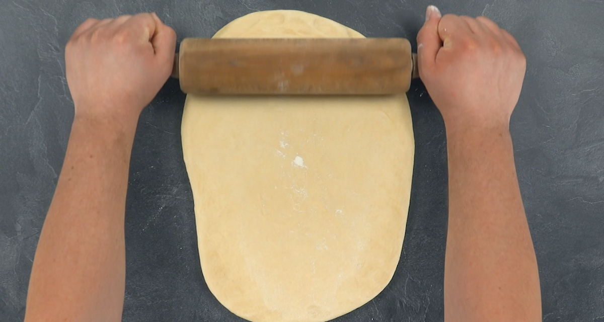 4) Sortez la pâte du réfrigérateur et étalez-la en rectangle (60 x 30 cm) sur le plan de travail avec un peu de farine.