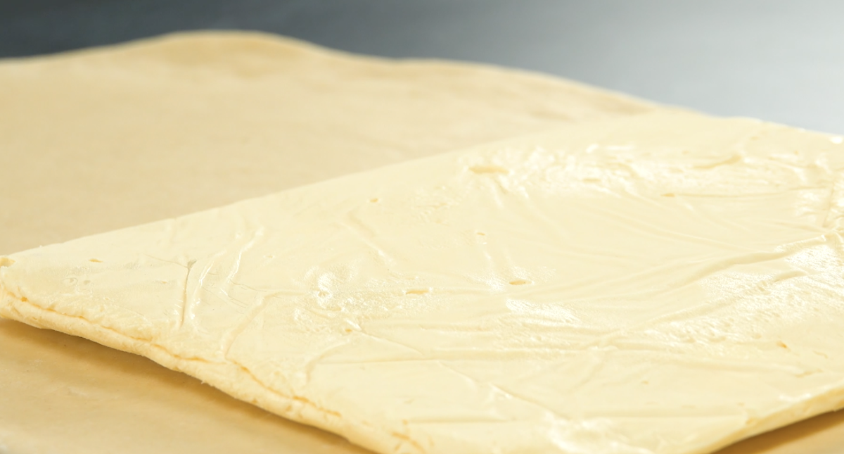 5) Lorsque la masse de beurre atteint les 15 degrés, sortez-la du réfrigérateur et placez-la sur la moitié de la surface du rectangle de pâte. Repliez la pâte puis étalez-la soigneusement et uniformément dans le sens de la longueur à l’aide d’un rouleau à pâtisserie.