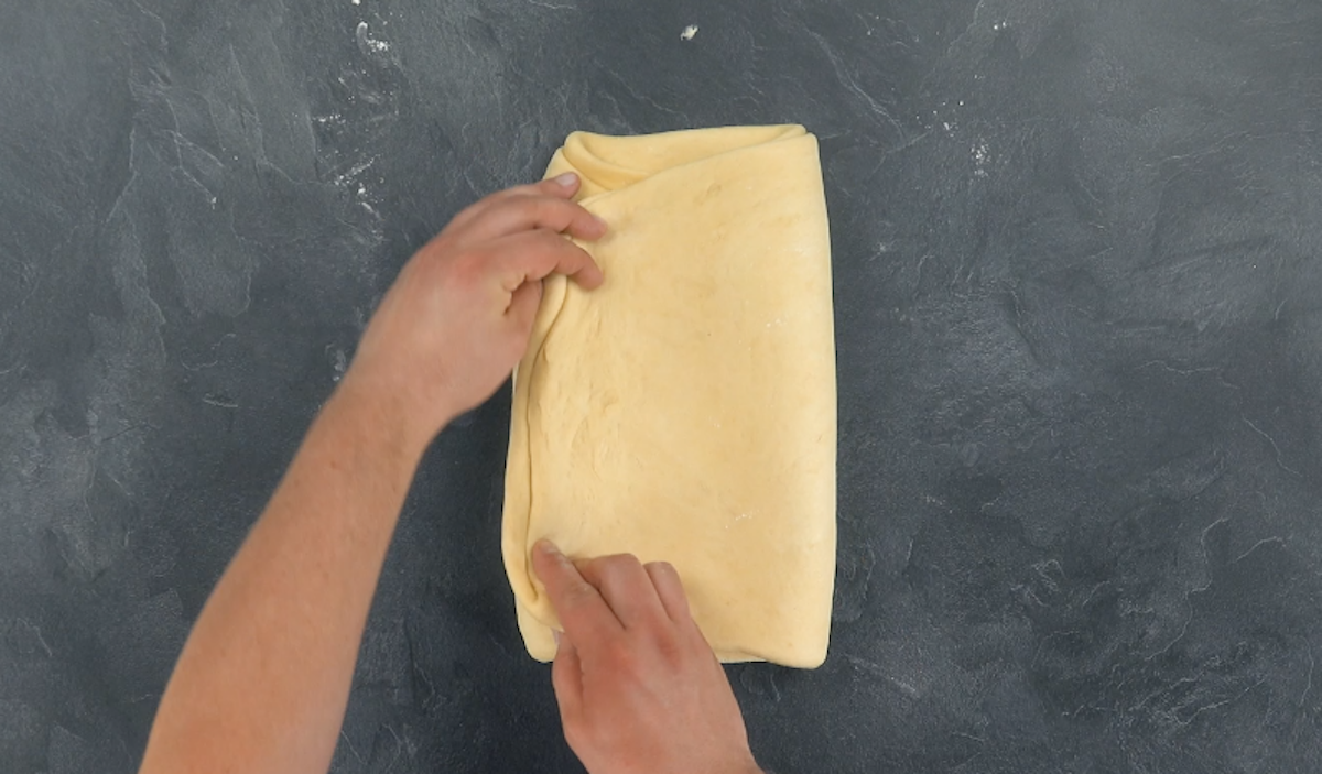 6) Pliez les deux côtés extérieurs de la pâte vers le milieu et pressez bien la pâte. Enveloppez le paquet de pâte dans du film alimentaire et remettez au réfrigérateur pendant 45 minutes.