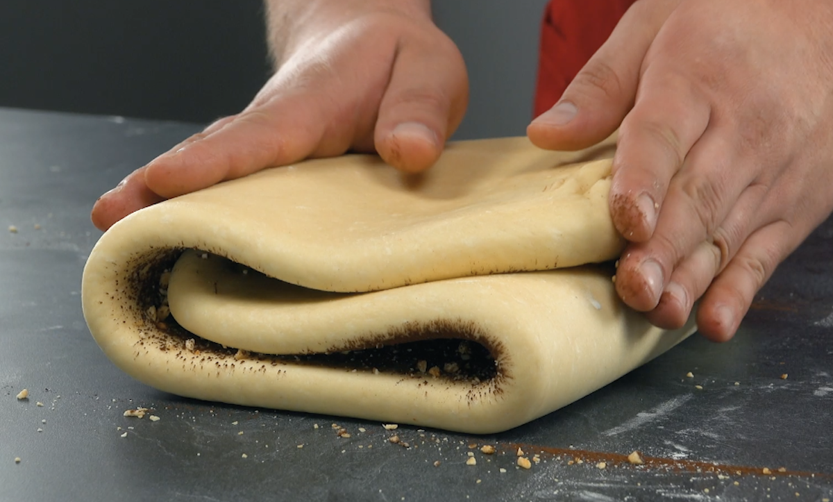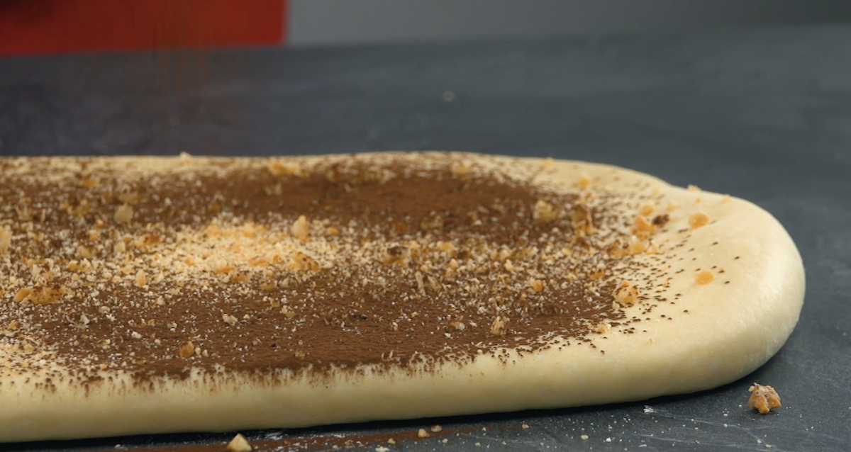 8) Revenez à la pâte : étalez-la dans le sens de la longueur puis saupoudrez-la d’une poignée de noisettes hachées et de cacao.