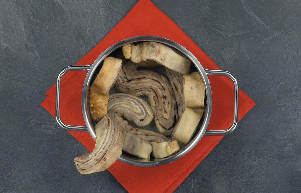 11) Étalez 4 à 5 lamelles dans le fond d’une marmite en les entortillant. Il est important que des bandes de pâte soient également placées debout au bord de la marmite.