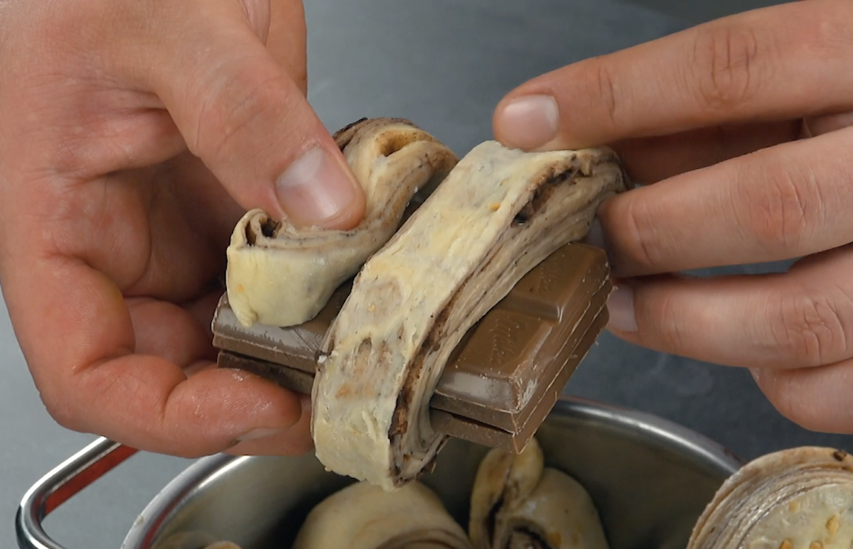12) Soit vous utilisez la ganache faite maison, soit une tablette de chocolat toute prête. Divisez la barre de chocolat en 3 blocs (3 fois 8 pièces). Mettez les 3 blocs l’un sur l’autre et enroulez une lamelle de pâte autour.