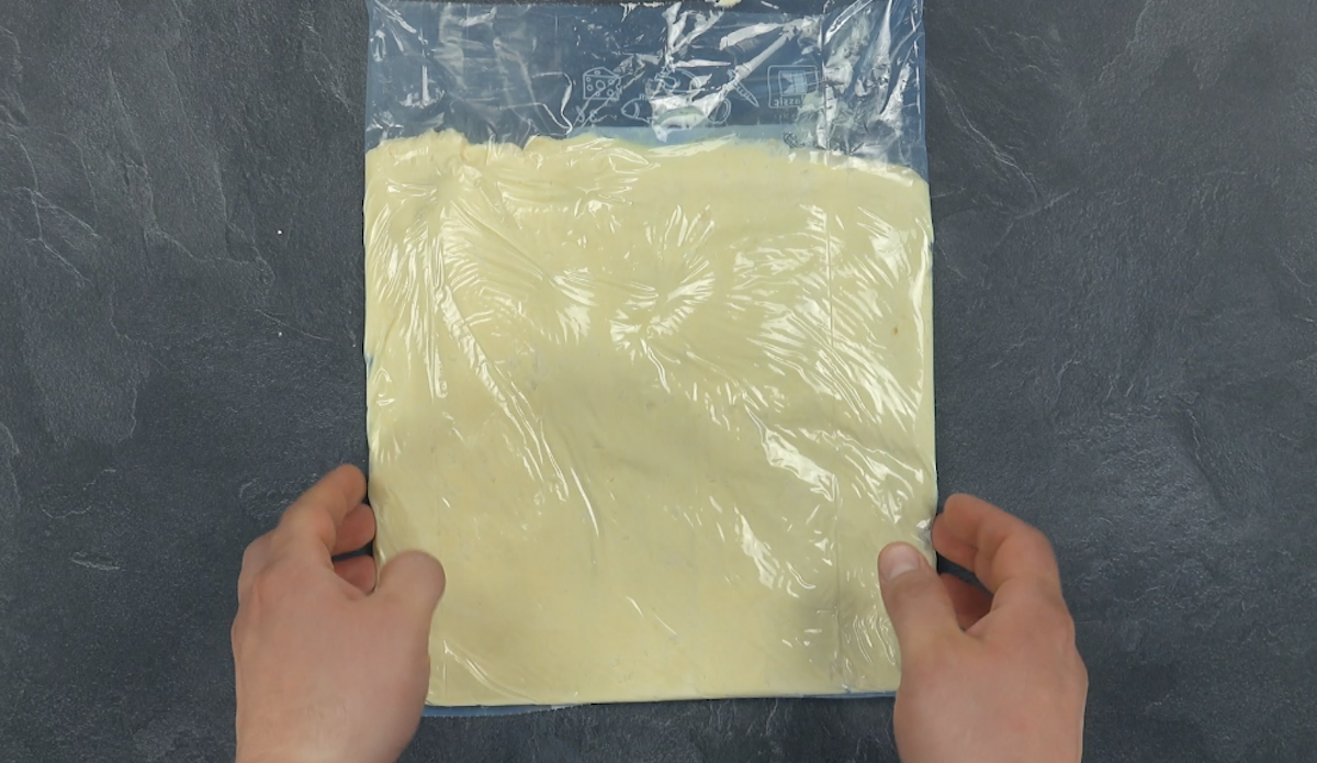 3) Pour la masse de beurre, ajoutez la farine au beurre mou et versez le mélange dans le sachet congélation de 6 litres. Étalez le mélange de manière à ce qu’environ 5 cm du sac ne soient pas remplis. Mettez au frais.