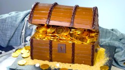 - Pour représenter le sable, étalez des petits beurre moulus autour du coffre au trésor. Décorez le haut du coffre au trésor avec du sucre doré et enfoncez des brochettes en bois dans le gâteau au chocolat. Ils permettront au couvercle du coffre au trésor de rester ouvert plus tard. Pour le couvercle du coffre, faites chauffer les guimauves et le beurre au bain-marie, puis ajoutez les Rice Krispies en remuant. Utilisez les Rice Krispies pour former le couvercle du coffre en pressant le mélange encore chaud autour d'un moule rectangulaire graissé ; le moule doit avoir les mêmes dimensions que le coffre au trésor. Attendez que le mélange ait refroidi et pris. Décorez le couvercle avec de la crème au chocolat noir, des KitKat et des bonbons chocolatés assortis. Recouvrez l'intérieur du coffre au trésor de pièces en chocolat et enfin, placez soigneusement le couvercle sur les brochettes en bois.