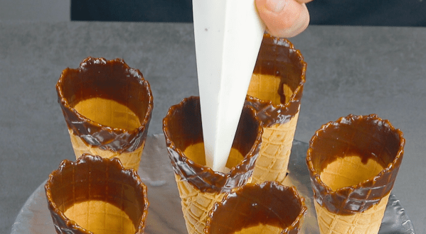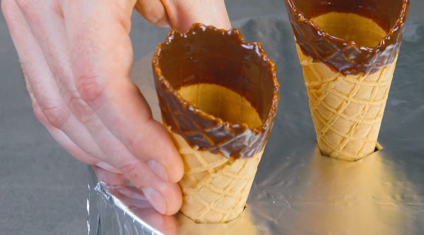 - Mettez du papier d'aluminium sur un bol ou une casserole. Trempez les cornets de glace dans la ganache et plantez-les ensuite dans le papier d'aluminium pour qu'ils puissent sécher debout.