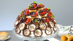 - Déposez une couche de cornets garnis de baies et de menthe fraîche sur le gâteau. Continuez de cette manière jusqu'à ce que le gâteau soit entièrement recouvert.
