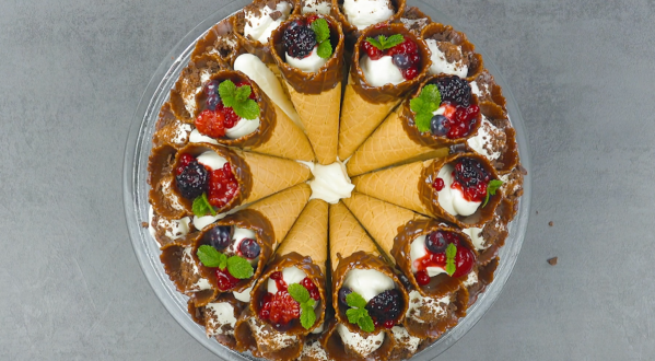 Que diriez-vous d’un gros gâteau fait de cornets de glace fourrés ? Nous trempons d’abord les cornets dans du chocolat, nous les remplissons d’une mousse au chocolat blanc et de baies, puis nous recouvrons les cornets de cette mousse pour en faire un gâteau XXL. Un rêve en forme de dôme !