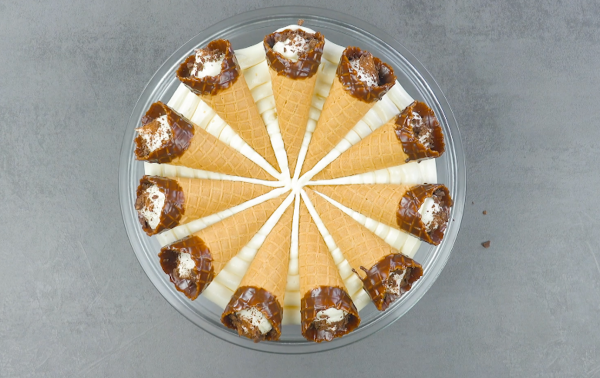 - Étalez une couche uniforme du reste de la mousse au chocolat sur un plat à gâteau. Placez 10 à 11 cornets fourrés (sans la menthe) sur la mousse. Remplissez les espaces intermédiaires avec de la mousse au chocolat blanc. Continuez de cette manière jusqu'à ce que le gâteau soit entièrement recouvert.