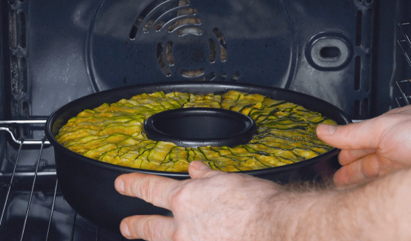 • Recouvrez un moule à savarin avec les tranches de courgettes cuites. Répartissez maintenant environ la moitié du risotto dans le moule. Utilisez ensuite une cuillère pour faire un creux dans le risotto tout autour. Placez 3 roulés de jambon dans le moule sur le risotto. Répartissez également les courgettes sautées sur le jambon. Mettez une autre couche de risotto par dessus. Repliez maintenant les tranches de courgette qui dépassent vers le centre du gâteau. Enfournez le moule à 150 °C pendant environ 30 minutes, en mode convection.
