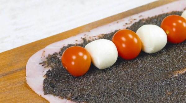 • Posez 2 tranches de jambon cuit l'une sur l'autre, en les faisant se chevaucher, et tartinez-les de tapenade. Placez également les tomates cerises et les boules de mozzarellas en alternance dans le sens de la longueur sur la tapenade et roulez le tout.