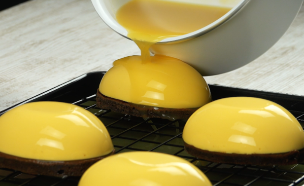 - Faites chauffer le jus d'orange avec du miel et ajoutez la gélatine humidifiée. Laissez la gelée refroidir à environ 20 °C, puis versez-la sur les "œufs" à la crème et laissez à nouveau refroidir le tout pendant au moins 1 heure. Nous vous conseillons de placer les gâteaux abeilles sur une grille afin de pouvoir y verser la gelée liquide sans en mettre partout.