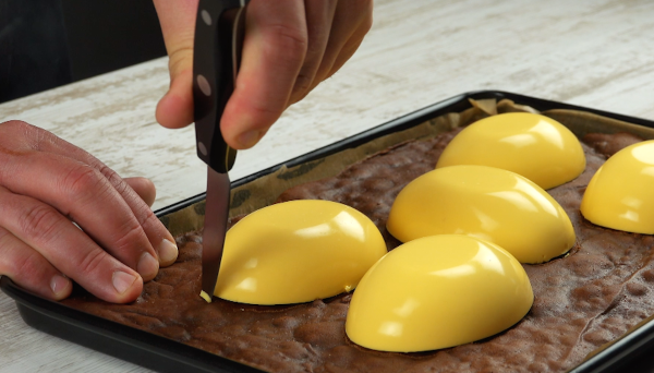 - Pressez soigneusement la crème au fromage frais solide hors du moule en silicone et placez-le sur le fond au chocolat cuit au four. Découpez le fond avec un couteau en utilisant les "œufs" de crème comme modèle.