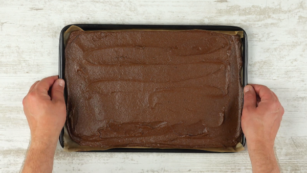 - Graissez une plaque à pâtisserie ou recouvrez-la de papier sulfurisé. Préchauffez le four à 180 °C.Mettez le chocolat noir fondu et l'huile dans un saladier et mélangez bien le tout à l'aide d'un fouet. Ajoutez le cacao, le sucre, le sel et le lait et mélangez à nouveau le tout. Ensuite, battez les œufs un par un et ajoutez la farine et l'arôme de vanille. Mélangez le tout pour obtenir une pâte. Étalez-la sur la plaque de cuisson et lissez le tout uniformément. Faites cuire la pâte pendant 10 à 12 minutes environ et laissez-la refroidir.