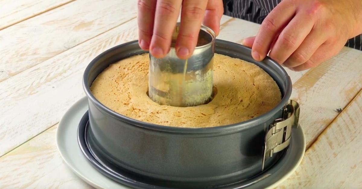 - Une fois le gâteau refroidi, retirez d'abord la boîte de conserve délicatement du gâteau. Démoulez le gâteau et coupez avec un couteau, à environ 1,5 cm du bord extérieur, un cercle de quelques centimètres de profondeur dans la pâte. Répétez la même procédure à une distance d'environ 1,5 cm du bord intérieur. Ensuite, utilisez vos doigts pour retirer la partie supérieure de la pâte entre les incisions afin d'obtenir une tranchée uniforme.