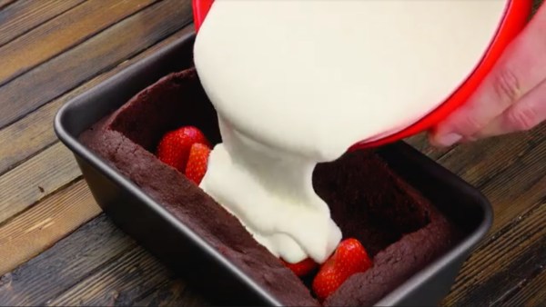 - Versez la pâte dans un moule graissé (23 x 13 cm) et enfournez pendant environ 45 minutes à 160 °C. Laissez refroidir le gâteau puis creusez-le avec une cuillère en laissant 2 cm au niveau des bords.