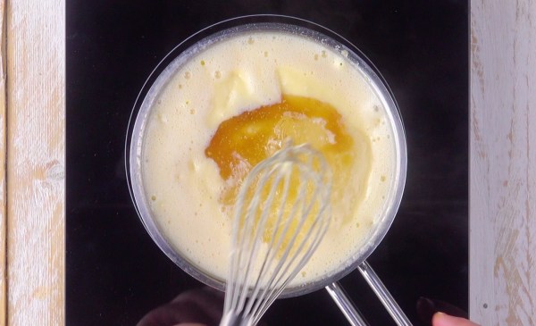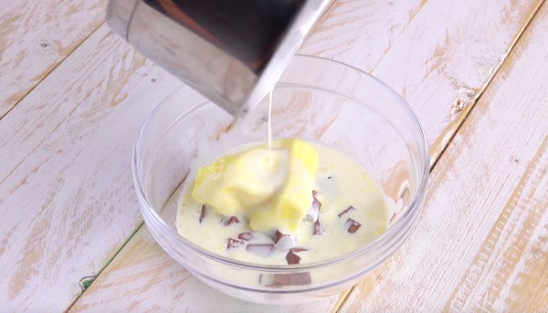 - Pour le glaçage, mettez d'abord le chocolat haché et le beurre dans un saladier. Portez la crème à ébullition puis versez-la sur le mélange. Attendez que le chocolat et le beurre fondent puis mélangez le tout avec un fouet pour obtenir une crème lisse.